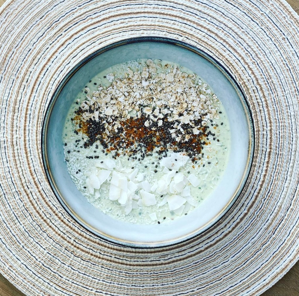 - Garneer met kokosvlokken, chiazaad, havermout en wat kaneel.