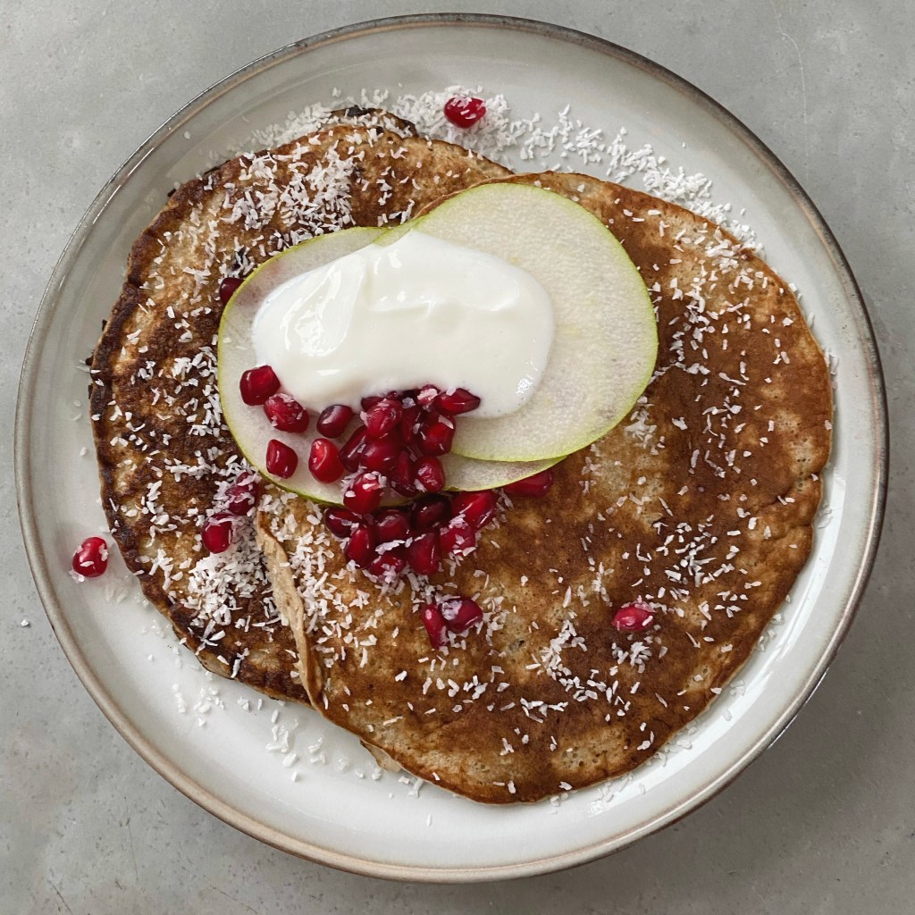 Gezonde pannenkoekjes met banaan, ei, havermout en kokos.