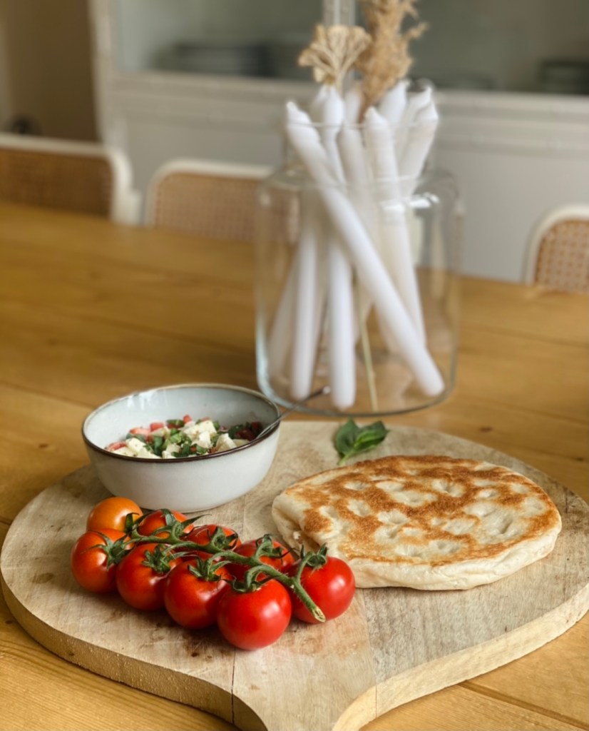 Turks broodje met tomaat, basilicum, mozzarella en oregano.