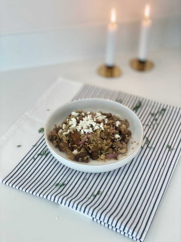 Bulgur, paddenstoelen, feta en dille van Ottolenghi.