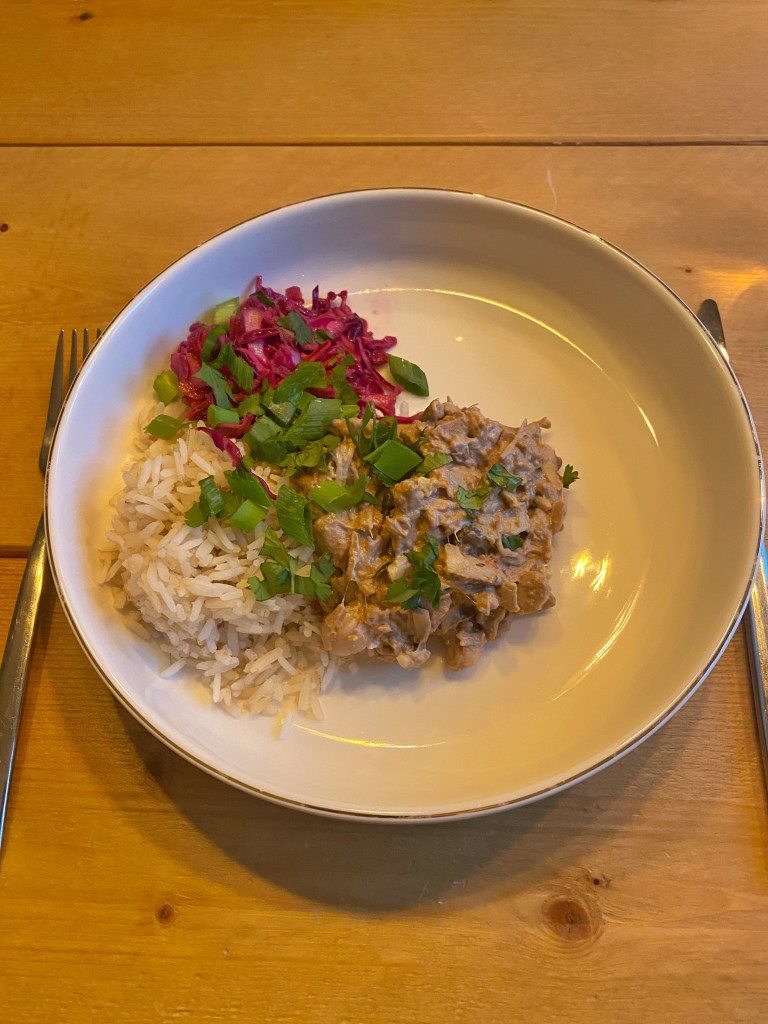 - Is de rendang mooi ingekookt? Maak je bord op met rijst, rendang, rode kool en koriander en bosui.